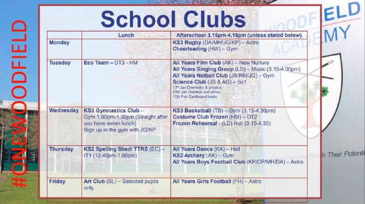 Please note that clubs will run from the second week of each half term, if you are ever in doubt, please contact the office to see if a club is on. Please also ensure that your child has a clear plan for getting home following the club.